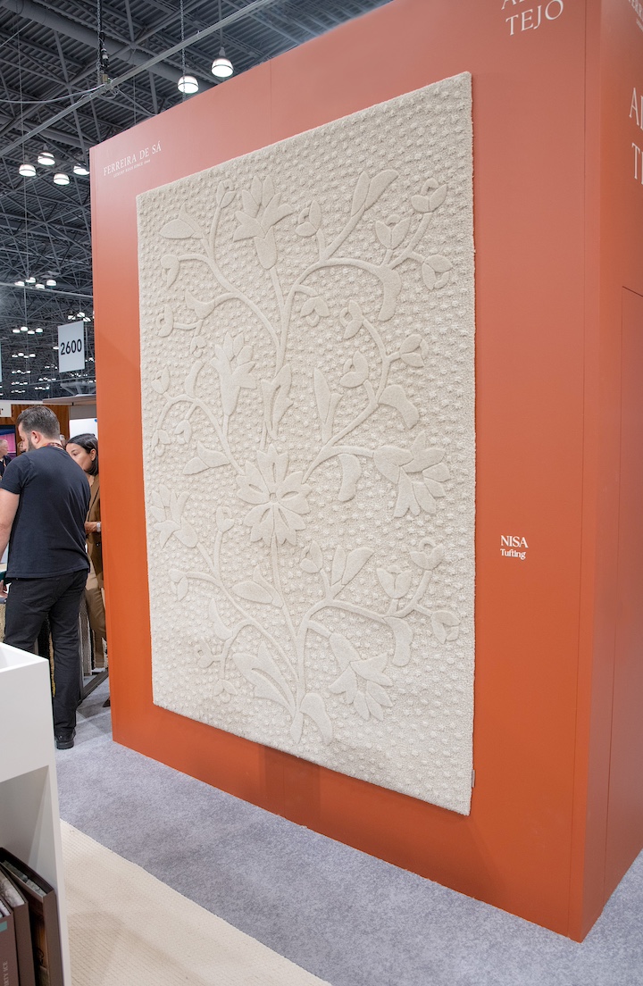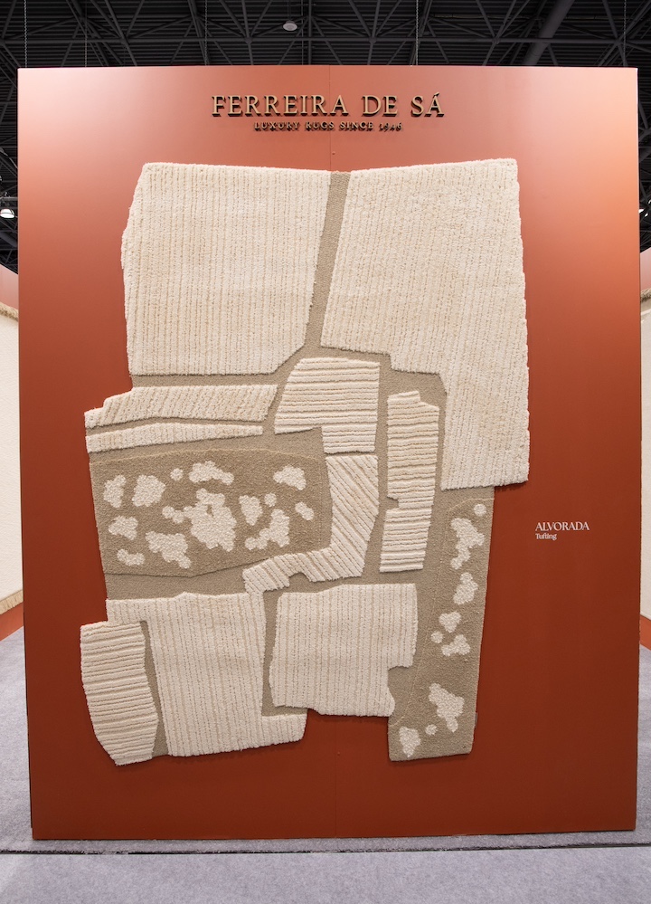 Among the showcased designs at Portuguese carpet and rug manufacturer Ferreira de Sa were several crafted of undyed wool. One of the showstoppers was Alvorada which features a tufted layered fluid motif that evokes the open fields of Portugal's southern Alentejo region. The company also featured the hand tufted Nisa, a natural-colored raised folk-inspired oversize floral pattern.