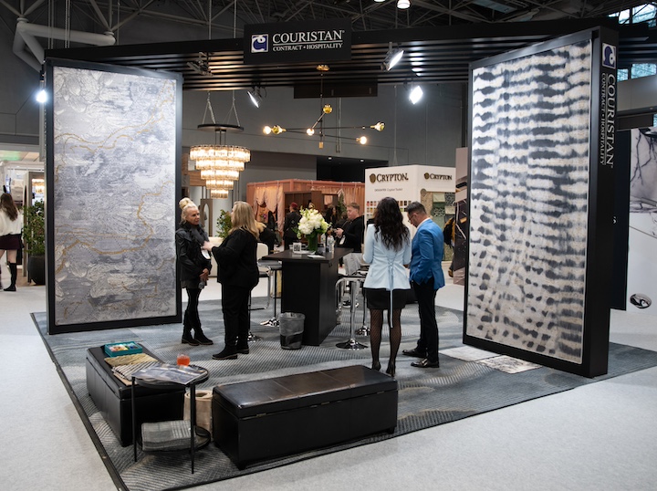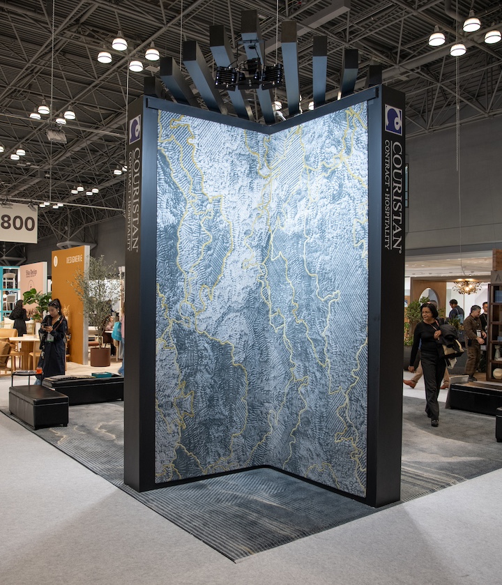 Couristan Hospitality unveiled its Couture Stitch collection, which found inspiration from fashion embellishments such as basting stitches, embroidery, crochet, knitting and tambour hook beading. The different effects are created by silken-spun filaments, which add a luminous sparkling effect and tactility to the abstract, organic flowing designs. Among the show-stopping designs was an abstract blue colored design with gold snaking through the abstract field inspired by rivers when viewed from far above. On the booth's floor was a linear patchwork-like pattern in blue and gray tones with warm accents that blur the edges of different rug design elements.