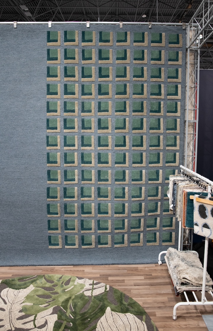 Creative Touch showcased a hand-tufted rug in a custom design created for a high-traffic commercial lobby. Crafted of a mix of wool and PET yarn throughout the ground with 100 percent PET yarn used for the design, the geometric pattern offers loop and cut texture in slightly varying pile heights that are ADA compliant.