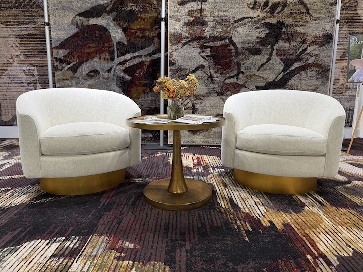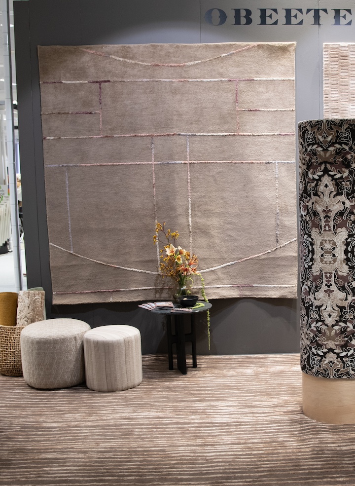 Obeetee debuted its Atelier collection at BDNY 2025. Featured in the booth was the collection’s hand-knotted Parallel rug (pictured above on the rear wall), which offers a subtle linear composition of warm neutral tones. Parallel is knotted of New Zealand wool in the base and a natural silk raised motif for a lustrous texture. In contrast, the Adorned rug (pictured right) offers an ornate motif inspired by filigree and brocade designs. It is hand-knotted of matte New Zealand wool with lustrous silk accents.