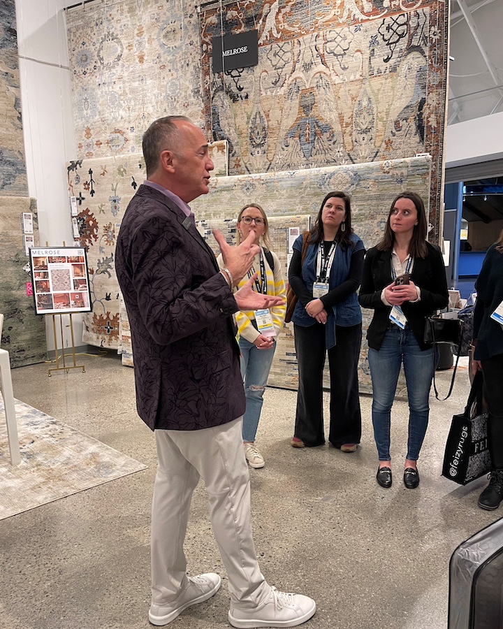 Feizy's Michael Bauer greets designers for a special tour of the company's designer area rug intros. Rugs pictured in the rear