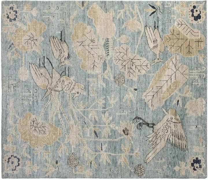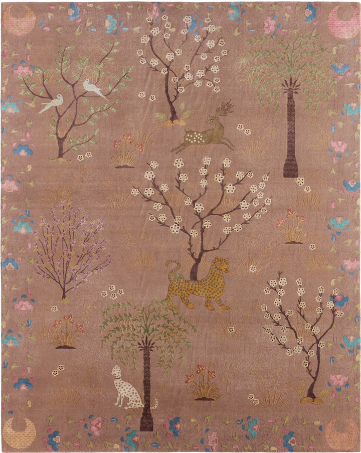 The showstopping Majnun collection is hand knotted in wool and debuts in three designs, each in two colorways. Inspired by the Cintamani motif MJL05 incorporates traditional Indian and Persian design. MJL03 evokes a celestial garden-inspired rug with Persian, Mughal, and Chinese influences, as is MJL01, with its stylized trees.