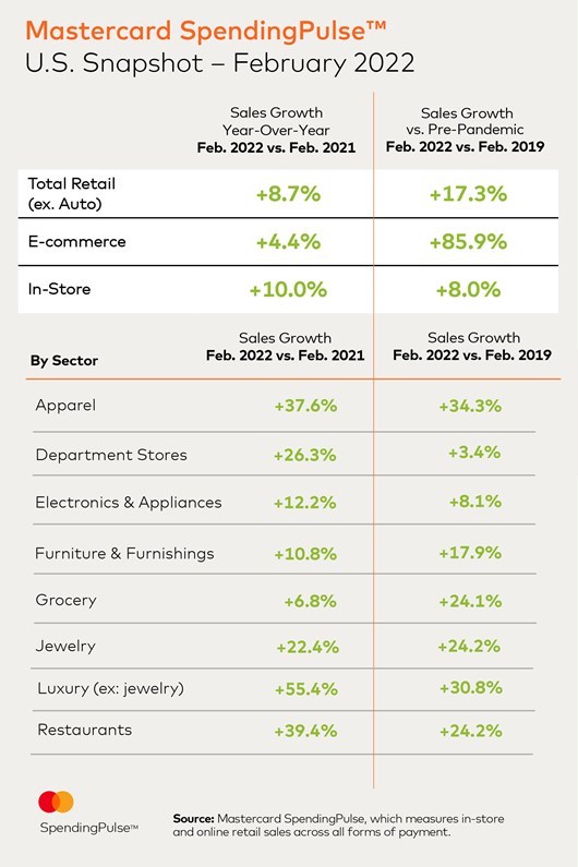 Mastercard SpendingPulse: February U.S. Retail Sales Rise 8.7%
