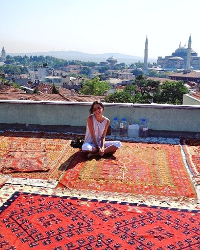 Sarah Zabihi poses with a selection of rugs in Istanbul, Turkey