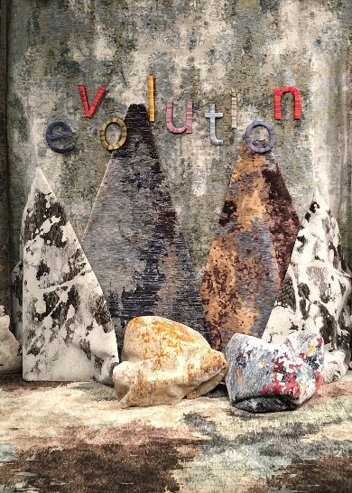A striking display at the Oriental Weavers AmericasMart showroom features rugs from the new Evolution collection of 16 abstract patterns inspired by elements from nature such as the weathered surfaces of rust, bark and stone.