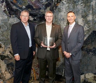 Oriental Weavers' David Moss, regional vice president-south, and Pat Muschamp, vice president of sales, accept the Visual Display Award from AmericasMart's Kevin Malkiewicz at the January 2017 Atlanta International Gift & Home Furnishings Market.