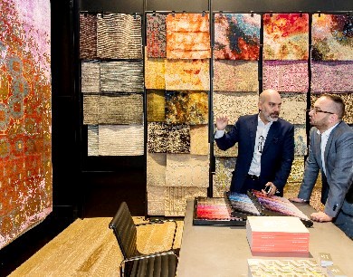 Corner samples of Jan Kath rugs fill a work area for designers in the new Dubai Mall Iwan Maktabi showroom. Mohamed Maktabi (left) with Design Days Dubai fair director, Cyril Zammit.