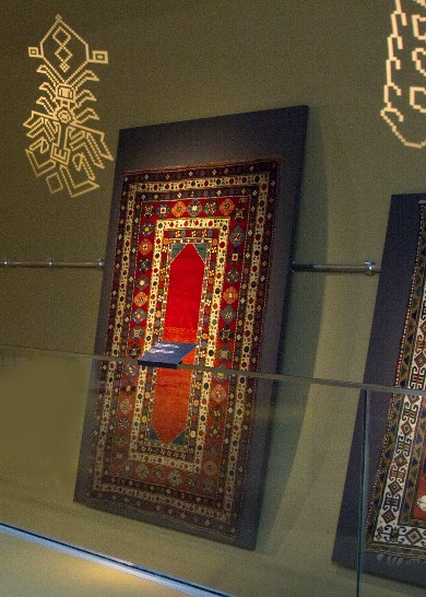 Carefully preserved Azerbaijani carpets from all periods are on exhibit at the Azerbaijan Carpet Museum, this piece displayed behind a wall of glass.