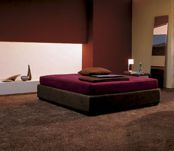 Maroon colored bed on chocolate carpet