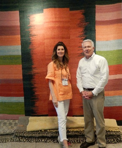 HOC designer Fabi Hens celebrated the studio's debut at The Rug Show at High Point with Eileen Hampshire of Art to Walk and husband, John. Hampshire bought the icy pale blue rug behind them at the show. LAPCHI