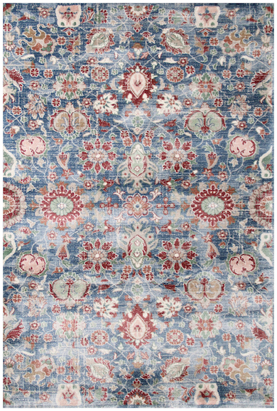 A bold palette meets patchwork chic in the Collage rug, seen here. The detail in the traditional floral pattern creates a fresh look in the fast-growing world of indoor-outdoor. The Havana collection, made from polyester, is incredibly durable making it a must have for any room inside or outside of the home. Havana is serigraphed and Wilton woven in Turkeyin available sizes of 23" x 35", 39" x 59", 4'11" x 7'6", 7'10" x 9'10, 23" x 7'6" runner. MSRP for 4'11" x 7'6" is $285.