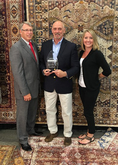 Bill Martin and Adrienne Wooddell of Rugs Direct flank Dean Smith of Trans-Ocean as he accepts the retailer's top honor, the Partner of the Year, awarded to Trans-Ocean. |