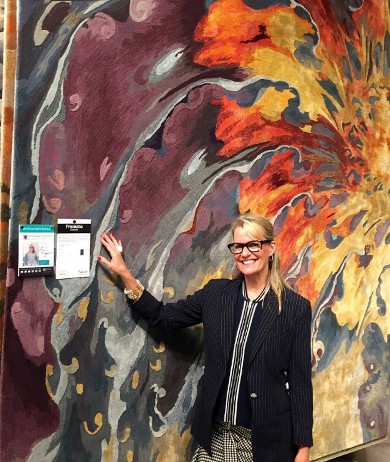 Julia Buckingham of Buckingham Interiors + Design in Chicago and Phoenix leads her Ahead of the Curve tour at LVM to Nourison, where she picks this dramatic Prismatic collection rug for her Instagram takeover.
