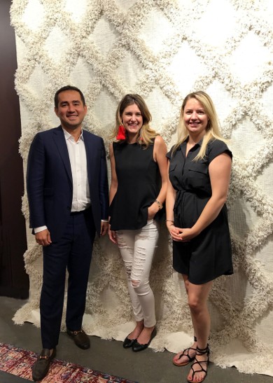 Nuloom's Koorosh Yaraghi and Monica Marquez flank Sara Weaver of Gilt, New York, all posing in front of a new shaggy diamond trellis design.