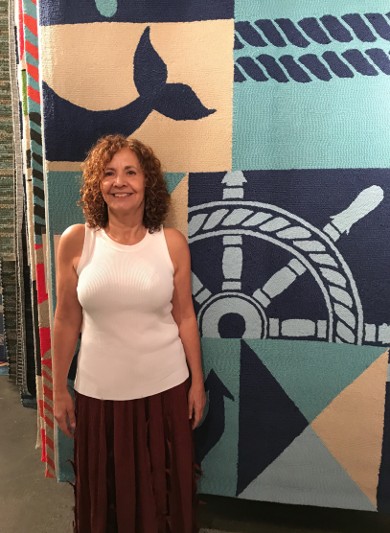 Trans-Ocean designer Liora Manne stands in front of a popular new coastal pattern called Nautical from the Napoli collection.