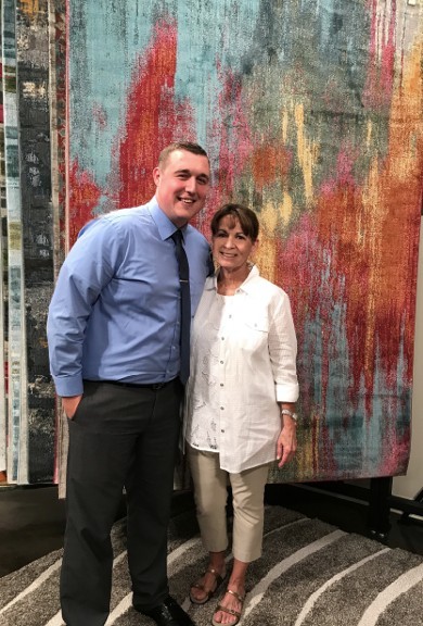 Dana Baze of the Final Touch in Edmond,Oklahoma, and Tayse's Travis Ayers pose in front of one of the rug maker's new boldly colored abstract designs.