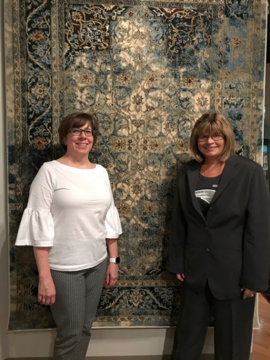 Betty Woodard and Diane Carleo of United Weavers pose in front of Camelot in cerulean, from the new Jules collection.