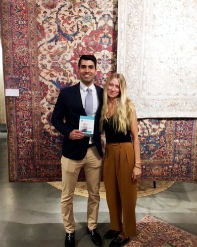 Cyrus Loloi and Lauren Williams of BOHO by Lauren / Lauren Williams Art + Home in Frisco, Texas, stand in front of the Loren collection, a favorite Loloi introduction chosen for her Las Vegas Market Instagram takeover.