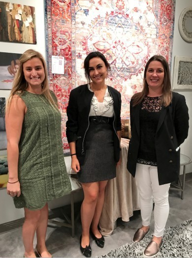 From left, Lauren Delucia, with Wayfair's AllModern, Dynamic Rugs' Anoosha Rouhanian and Joan Bolick, AllModern, pose in front of a popular Chalet collection rug.
