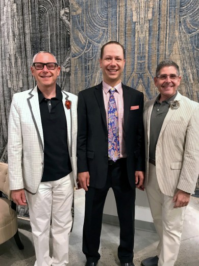 Lance Robbins and Cary Vogel, right, of Vegas-based Interiors by Cary Vogel, flank Cameron Feizy while admiring the architectural Art Deco-inspired one of a kind design behind them.