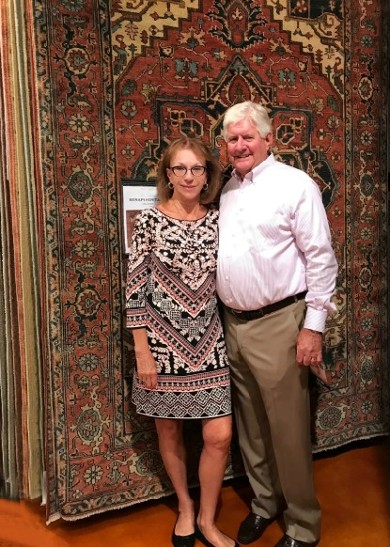 Dottie and David Mink Sr. toured Las Vegas Market with the Kenneth L. Mink & Sons team that manages Macy's Fine Rug Galleries, posing here in front of a Serapi Heritage rug at the HRI showroom.