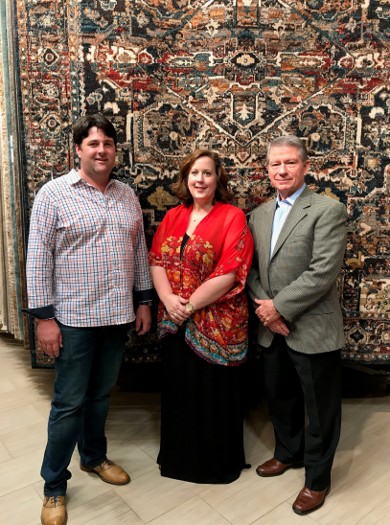 From left, Barry and Laura Otts of Otts Furniture in Gainesville and Karastan's John Huff, territorial manager for Karastan, pose in front of the popular Spice Market collection's Alacantara design in sapphire.