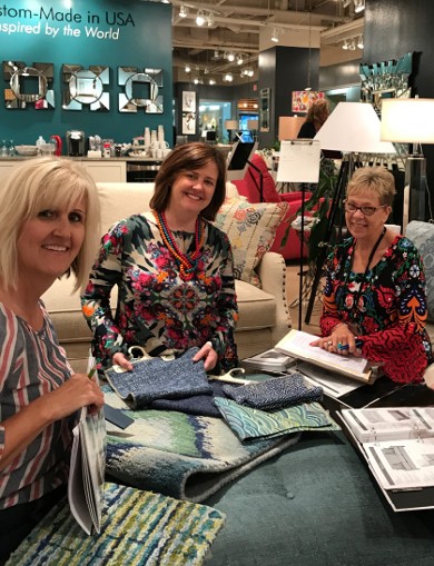 Susan Cunningham of Simply Klassic Interiors in Queen Creek, Arizona, browses fabrics and rug samples with Company C's Christine Chapin (center) and Mary Sherwood of Norwalk Furniture.