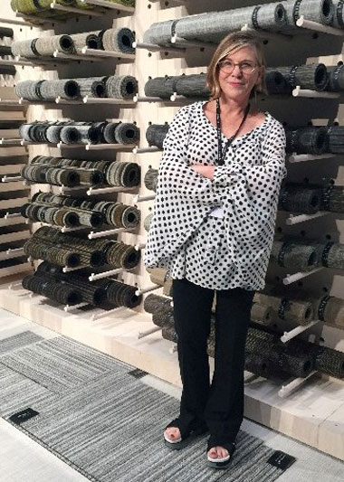 Margo Selby is standing on Lanark, a hand carved Wilton rug
