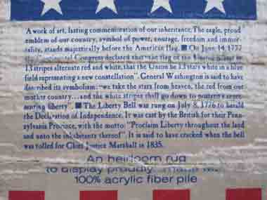 We are happy to send you photographs of our "1776 Rug." We got the rug back in 1976 from my late father who was a 56 year Mohasco employee. We enjoyed the rugnews.com commentary on the Patriotic Rug tradition. Cordially, Neil D. Ammerall  Label on the back of the 1776 rug The rug label reads: A work of art, lasting commemoration of our inheritance. The eagle, proud emblem of our country, symbol of power, courage, freedom and immortality, stands majestically before the American flag. On June 14, 1777 the Continental Congress declared that "the flag of the United States be 13 stripes alternate red and white, that the Union be 13 stars whit un a blue field representing a new constellation." General Washington is said to have described its symbolism: "we take the stars from heaven, the red from our mother country...and the white stripes shall go down to posterity representing liberty." The Liberty Bell was rung on July 8, 1776 to herald the Declaration of Independence. It was cast by the British for their Pennsylvania Province, with the motto: "Proclaim Liberty throughout the land and unto the inhabitants thereof." It is said to have cracked when the bell was tolled for Chief Justice Marshall in 1835. An heirloom rug to display proudly. Made with 100% acrylic fiber pile. ED NOTE: We are extremely grateful to Mr. Ammerall for kindly sharing these images with readers of Rugnews.com. To read the recent commentary on the 1776 rug, click here 12.30.09 Use the comment box below to share your thoughts with rugnews.com readers. Feel free to comment on the state of the industry, share tips on improving business or just to let off steam. Please do not use this privilege to make libelous remarks or to sell your products.