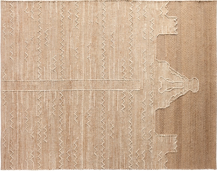 From the Distinctive Jute series comes Song of the Sahara, which offers an updated take on animal-inspired rug Kaburi design SOS01. A tribal narrative with a Wabi Sabi aesthetic is handwoven of jute with a natural tan jute pile that highlights intricately woven geometric patterns and a distinctive animal head motif.