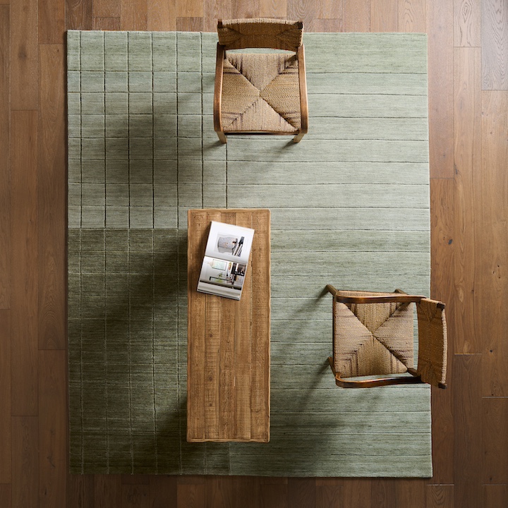 Linear Motion offers contemporary geometric designs in both saturated and more neutral palettes. LMN02, the Dommel design, features a deep rich green palette and is hand-knotted with a Nepalese technique from lustrous Afghan wool. Its high-low pile creates a textural grid and stripes. The abstract composition of Esra (LMN03) is rendered in a palette of sandy beige and grays tones. This handcrafted, 100 percent wool rug, rooted in Nepalese tradition, features a dynamic high-low pile, with a subtle sheen and inviting softness underfoot.