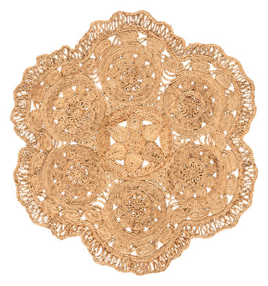 Cerceles collection from Jaipur is a departure from traditional rug shapes and offers a variety of round rugs crafted of 100 percent natural jute. The Freesia rug, pictured, features a star-shaped center and a scalloped edge, with intricate details and an open weave.