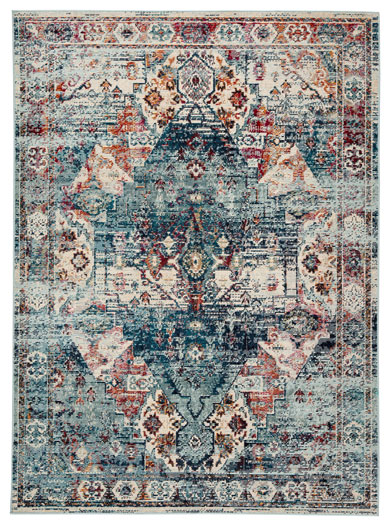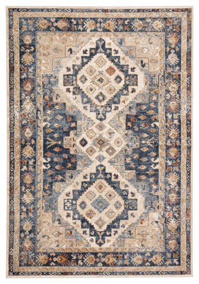 Sarinen features antiqued and distressed patterns in power-loomed polyester for a durable and easy-care, but lustrous finish. The Sunaya rug, pictured, is based on a traditional medallion design in deep blues and neutrals.