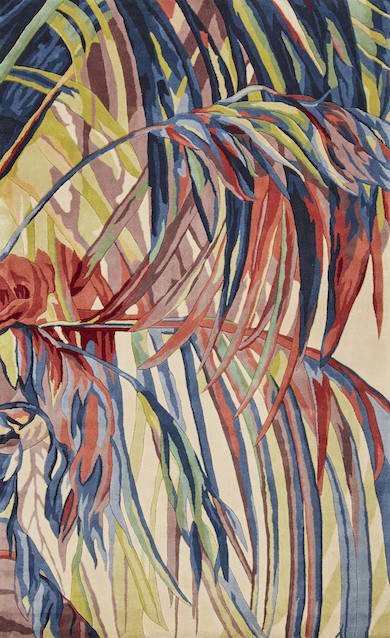 The hand-tufted wool Catalina collection design 790 from Kas Rugs proves the perfect canvas for a touch of peachy pink on tropical foliage.