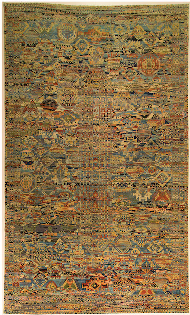 Designed specifically for the exhibition, the History Rug illustrates Tezcan's contemporary take on the rugs of Afghanistan. It combines motifs from 20 different Afghani carpets.