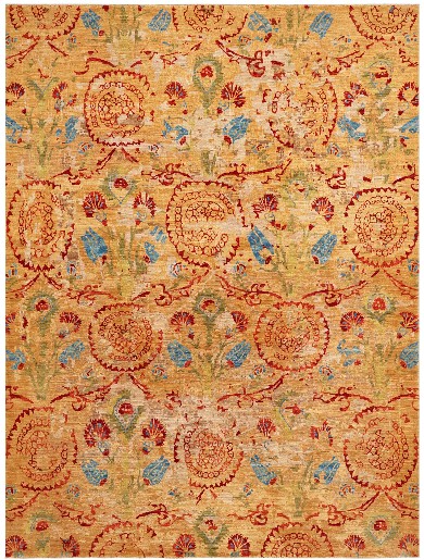 "These carpets are inspired by historic designs from places on the Silk Road: Khotanese designs from western China, Suzani designs from what is now Uzbekistan, Farahan designs from Iran, and Ottoman designs from the Ottoman Empire," Tezcan explained. "In addition to preserving the history that comes with these aged beauties, I try to rearrange patterns, colors, and even the scale of design to have them appear uninterrupted."